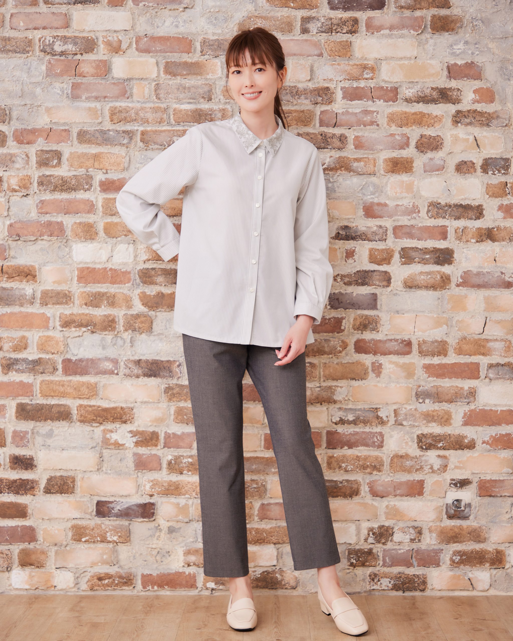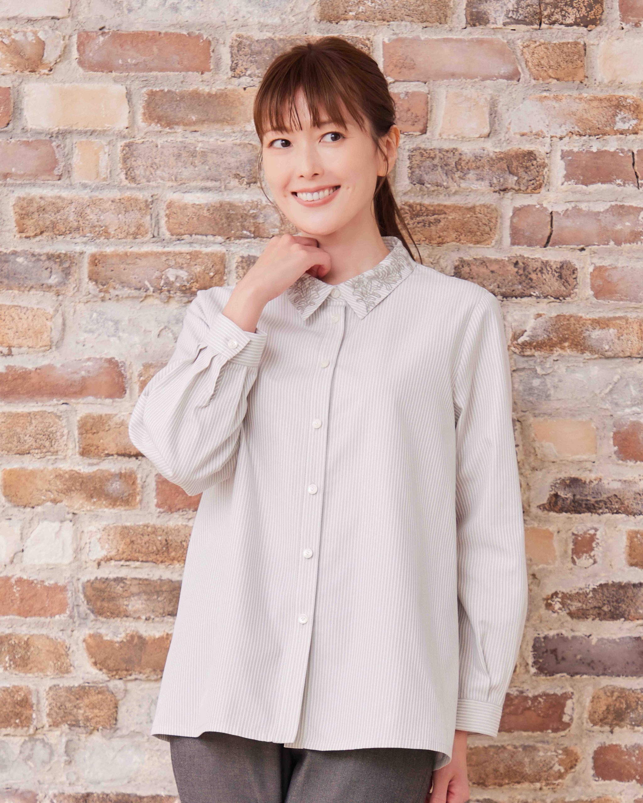 上品な襟の刺繡をアクセントにしたドビーストライプブラウス。 すっきりとした細めのドビーストライプは、ハオリアイテムとのコーディネートもおすすめです。 ■Shop List