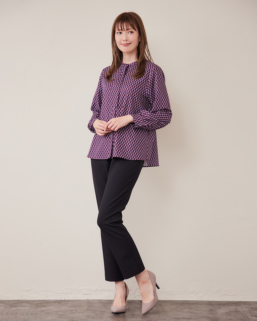 エレガントな印象を与えるラッフルタイブラウス。