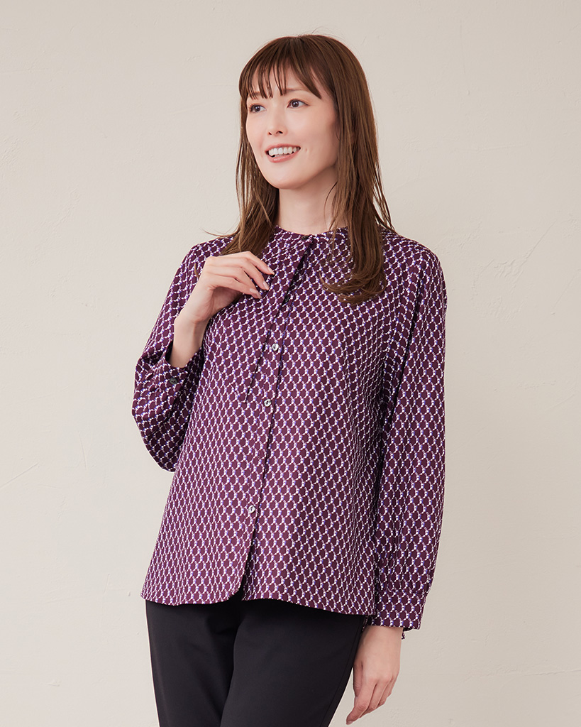 美しい光沢のポリエステル素材に上品なジオメトリックプリントできちんと感のあるルックスに。