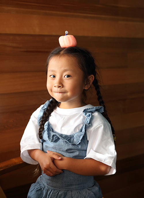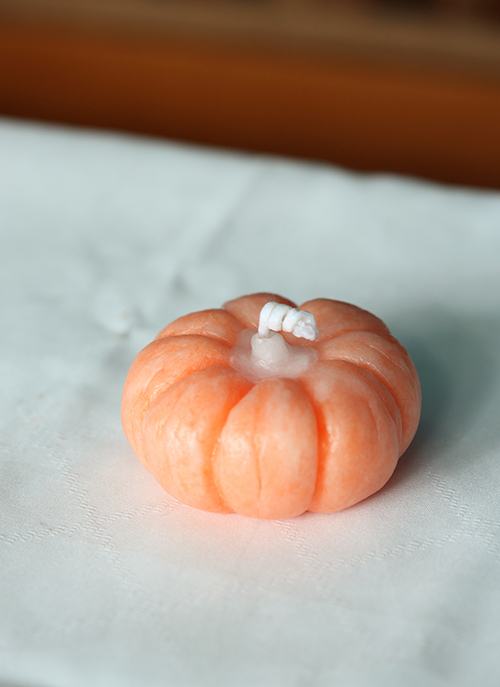 ヘタの青をアクセントにしたかぼちゃキャンドル。ちょっといびつだったり、筋が均等でなかったりするのも、大人には真似できない唯一無二の魅力です。