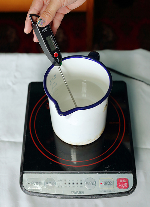 1.パラフィンワックスをホーロービーカーに入れ、加熱して溶かします。高温になると引火したり酸化したりする恐れがあるので、90℃以上にならないように注意!