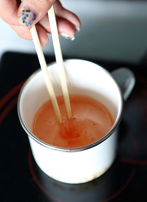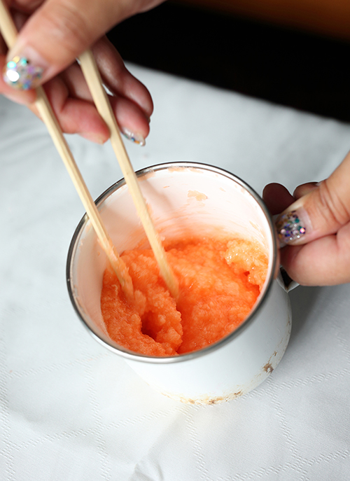 2. 別のホーロービーカーに溶かしたパラフィンワックス80gとキャンドル用顔料を少量入れ、割り箸でかき混ぜます。残ったパラフィンワックスは、かぼちゃのヘタ用にとっておきます。