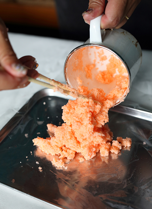 手でよくこねてきれいなピンク色に。まるで和菓子の練り切りのような美しい造形に仕上がっています。聞くところによると、何度もワークショップに参加されているそうです。
