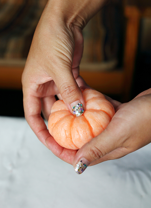 6.ラップをはずし、手や竹串でかぼちゃの形に整えます。
