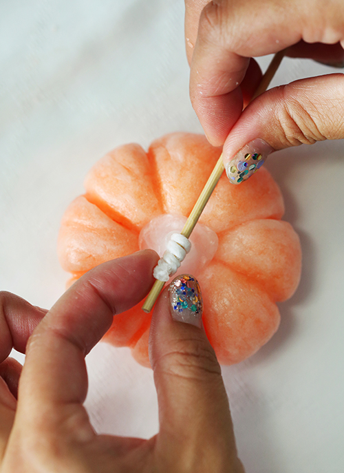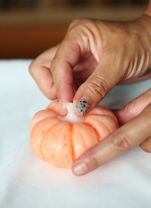 7.残りのパラフィンワックスでヘタの形を作り、かぼちゃの上にのせます。