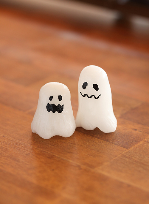 1〜4と同様にパラフィンワックスをラップに包んだら、手でオバケの形に成形し、アクリル絵の具で顔を描きます。キャンドル芯をつける場合は、8〜10と同様に仕上げます。