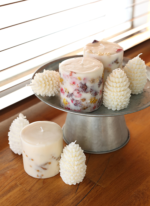 「植物を入れたボタニカルキャンドルには、季節に合わせたドライフラワーやプリザーブドフラワーを閉じ込めています」。