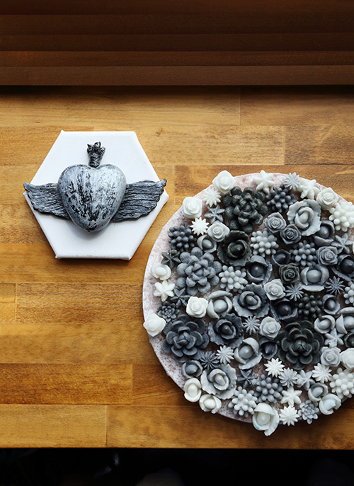 羽の生えたハートと多肉植物の寄せ植えをモチーフにした、壁に飾るキャンドル。展示会に合わせて制作された作品で、あえてキャンドル芯を使わず、見て楽しむために作られたそうです。