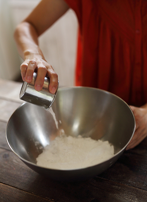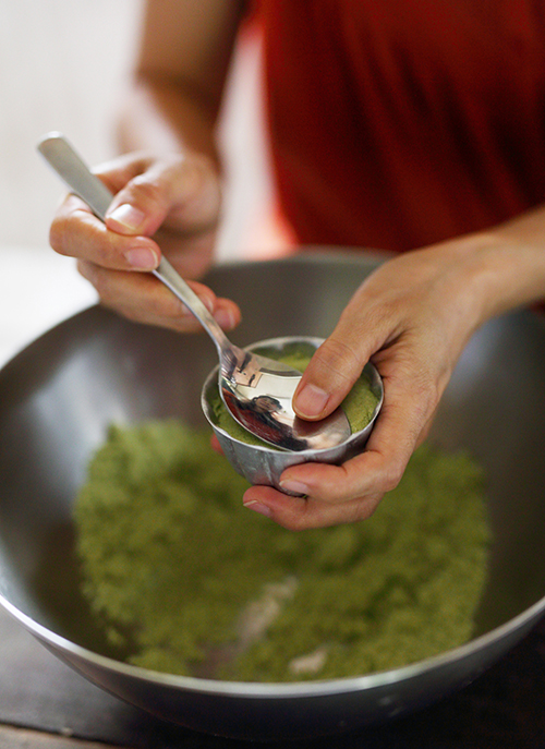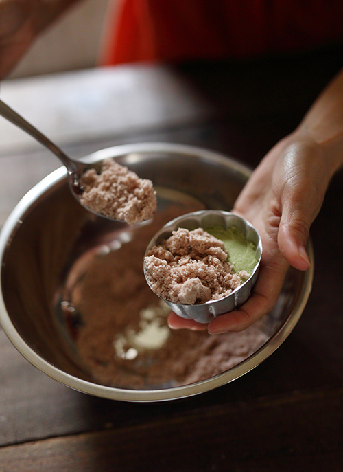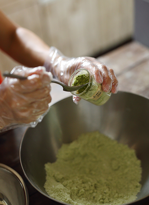 5.4の粉の1/3を新しいボウルに移し、残った2/3の粉に抹茶パウダーを入れて混ぜます。