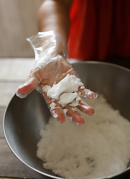 3.手袋をつけ、手早く混ぜたりこすり合わせたりします。