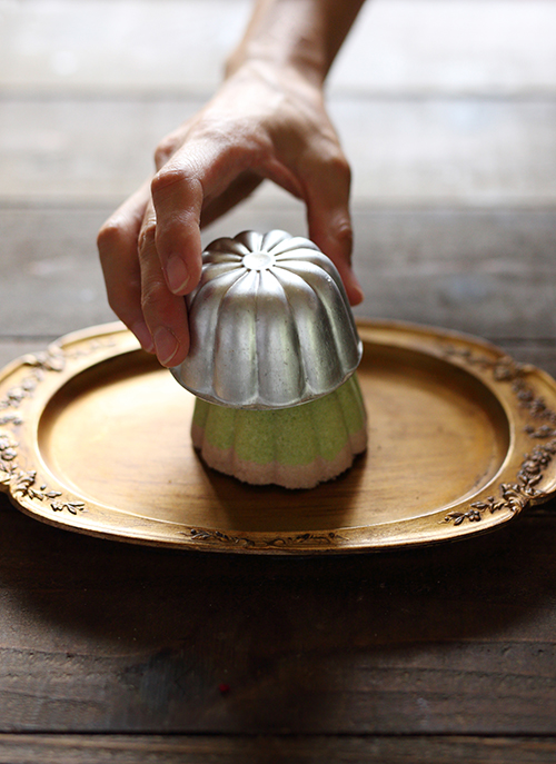 8.5の粉を少し入れ、スプーンの背や指を使って押し固めます。これをくり返し、ゼリー型の3/4くらいまで詰めていきます。