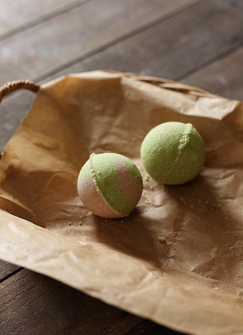 バスボム専用の型を使えば、球体にすることも。2色の粉を交互に詰めれば、ストライプ柄も楽しめます。