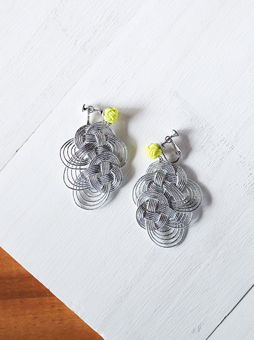 シルバーやゴールドの水引を使ったアクセサリー。ジュエリーのようでありながら、手仕事ならではの揺らぎや趣が感じられます。