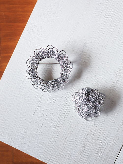 レースのような美しい透かし模様のブローチ。一見、無造作にねじったように見えて、じつはあわじ結びの連続で構成されています。