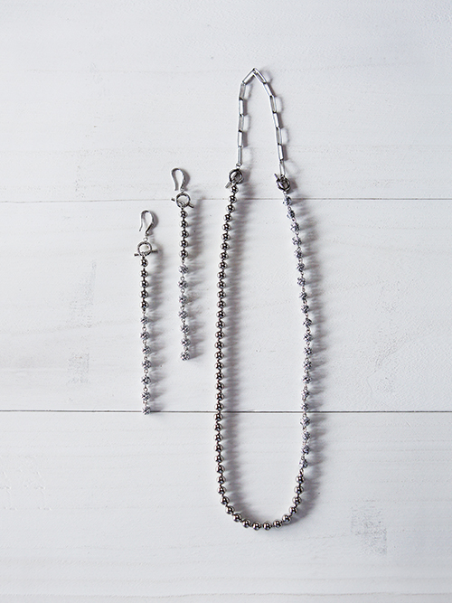 アシンメトリーにデザインされたネックレスと、縦長のシルエットが印象的なロングピアス。ネックレスは長さが調整でき、重ねづけも楽しめます。ビーズは樹脂素材なので、見た目より軽いつけ心地です。