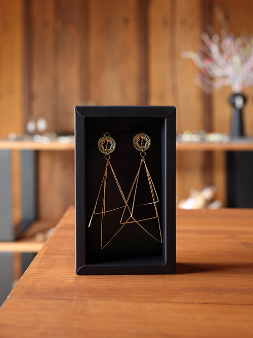台湾茶の香水ブランド「P.Seven」とコラボしたピアス。お茶をイメージしたグリーンの水引がアクセントに。サイズの違うトライアングルが耳もとで神秘的に揺らめきます。