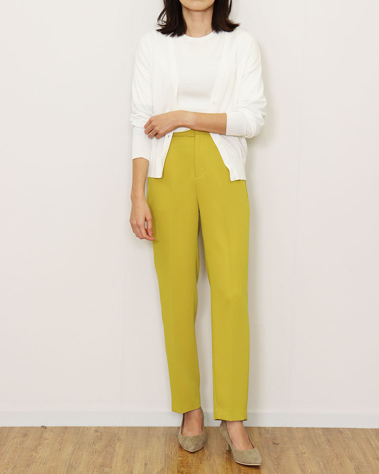 挑戦しやすいカラーパンツの1つ「イエロー」のコーディネート。