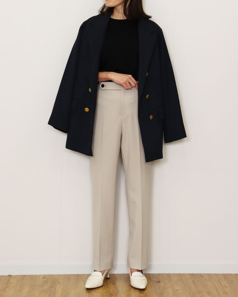 クリーンな印象のベージュカラーパンツのコーディネート。