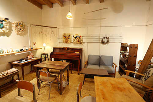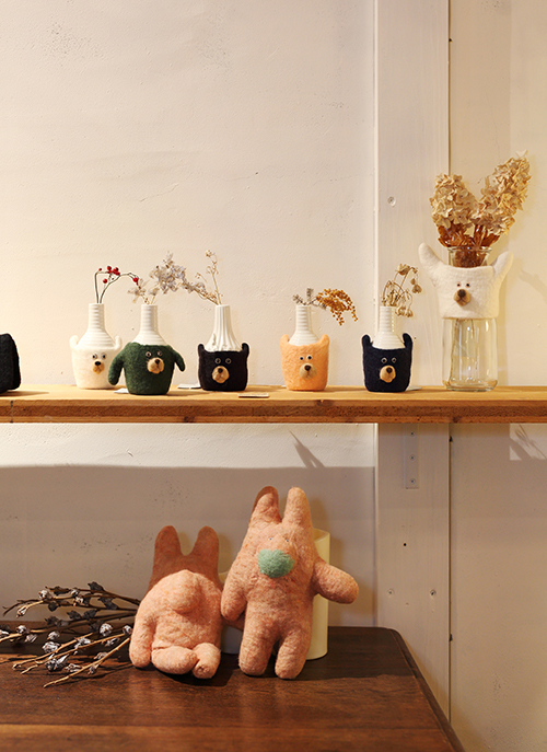 取材に訪れた日は、羊毛造形作家の渡辺泰子さんの作品を展示販売。日常に潜む生き物“ひそむ”の姿に癒されます。ぬいぐるみのほかにも、花器カバー、定期入れなども目を引きます。(現在、こちらの展示は終了しています)