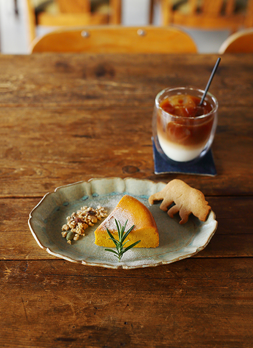 濃厚な味わいのかぼちゃのチーズケーキ600円、数種類のスパイスを使ったクマクッキー100円、ミルクによく合う自家焙煎コーヒーのアイスカフェオレ650円