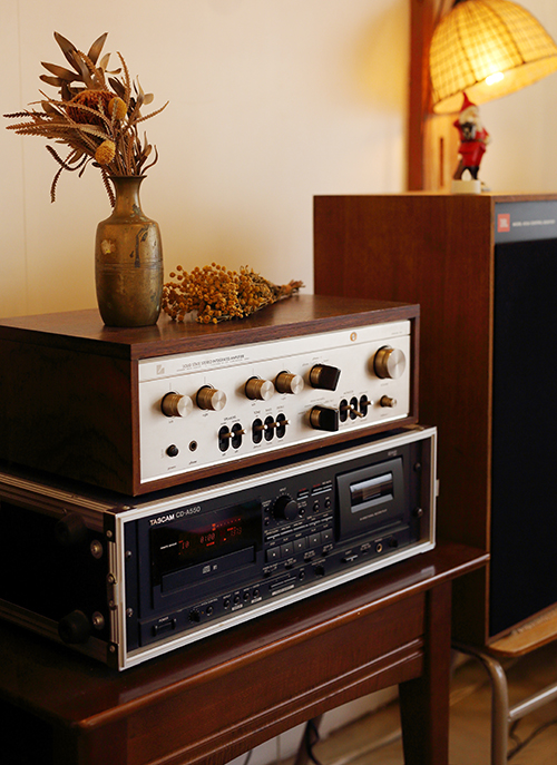 使い込まれた家具になじむスタイリッシュなオーディオ。オーディオに詳しくない人でも、音へのこだわりが一目でわかります。