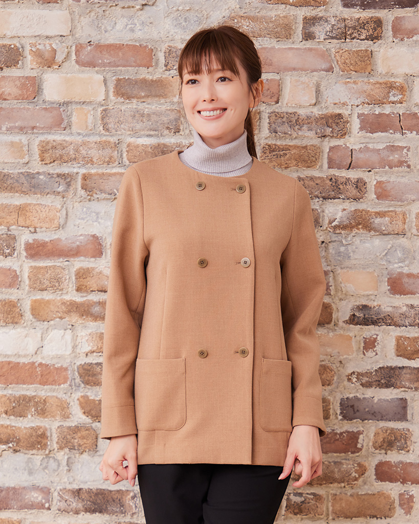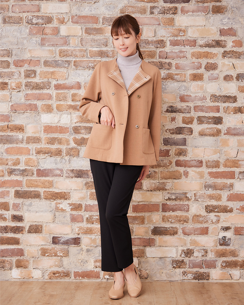 表無地、裏チェック柄のダブルフェイス素材を使用したノーカラーWボタンジャケット。