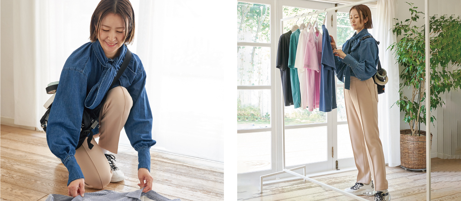 STORYのパンツはすべてご家庭で洗濯できるので、汚れを気にせずオンでもオフでもアクティブにはいていただけます。