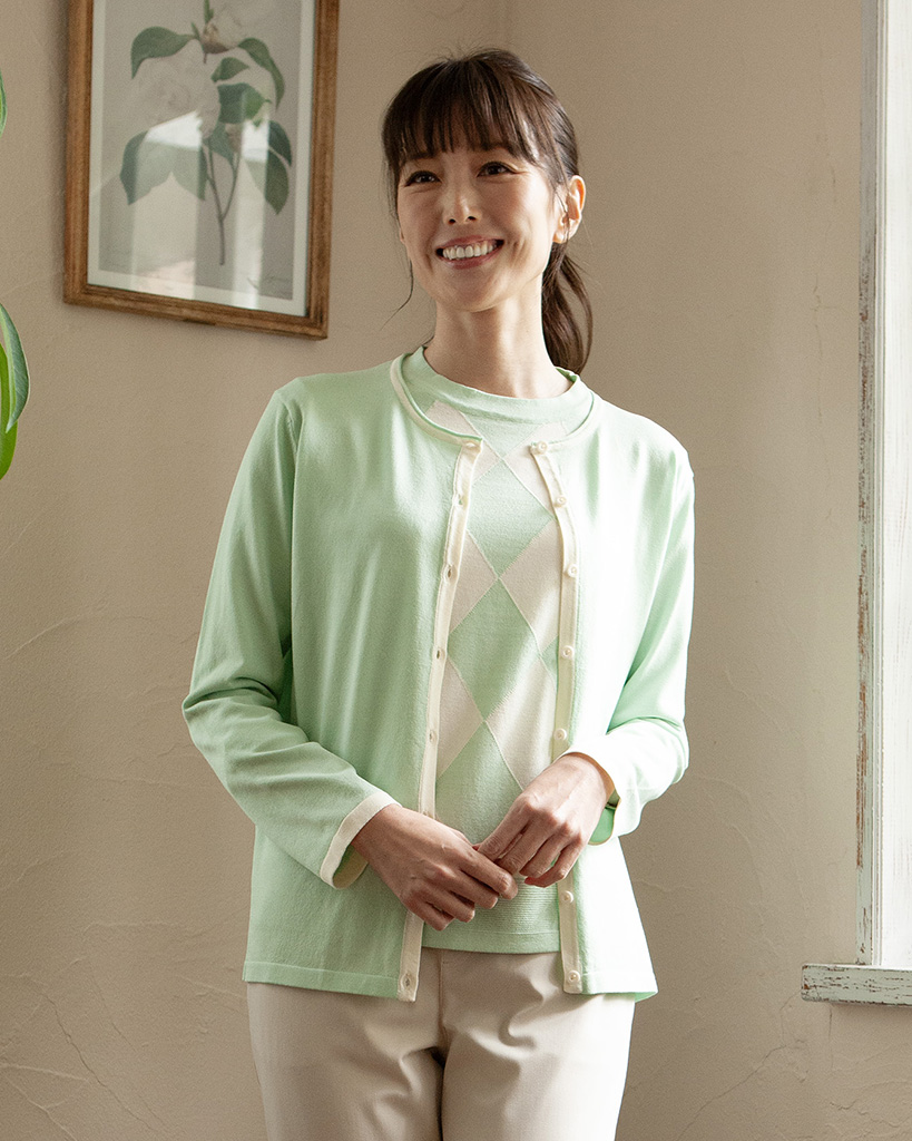 首元や前立て、袖口のカラートリミングをアクセントに、ベーシックなシルエットで着合わせ力の高いクルーネックニットカーディガン。