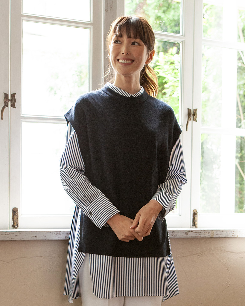 立体感のある畔編みでキレイメレイヤードスタイルにおすすめのクルーネックニットベスト。