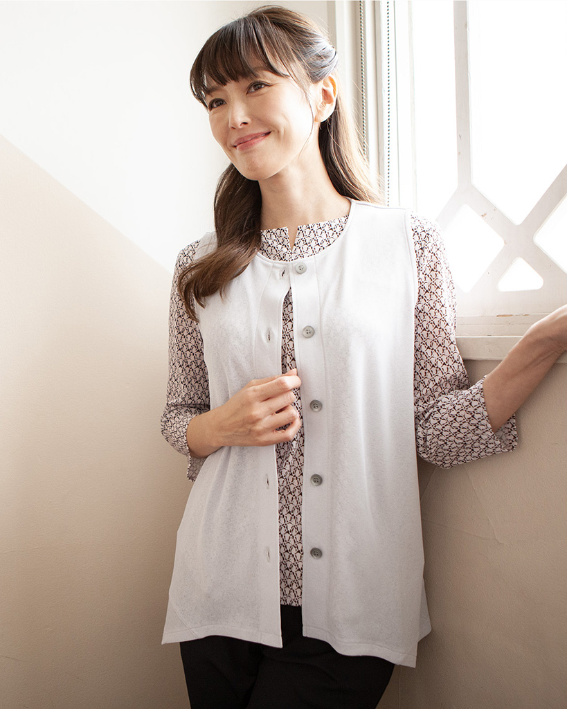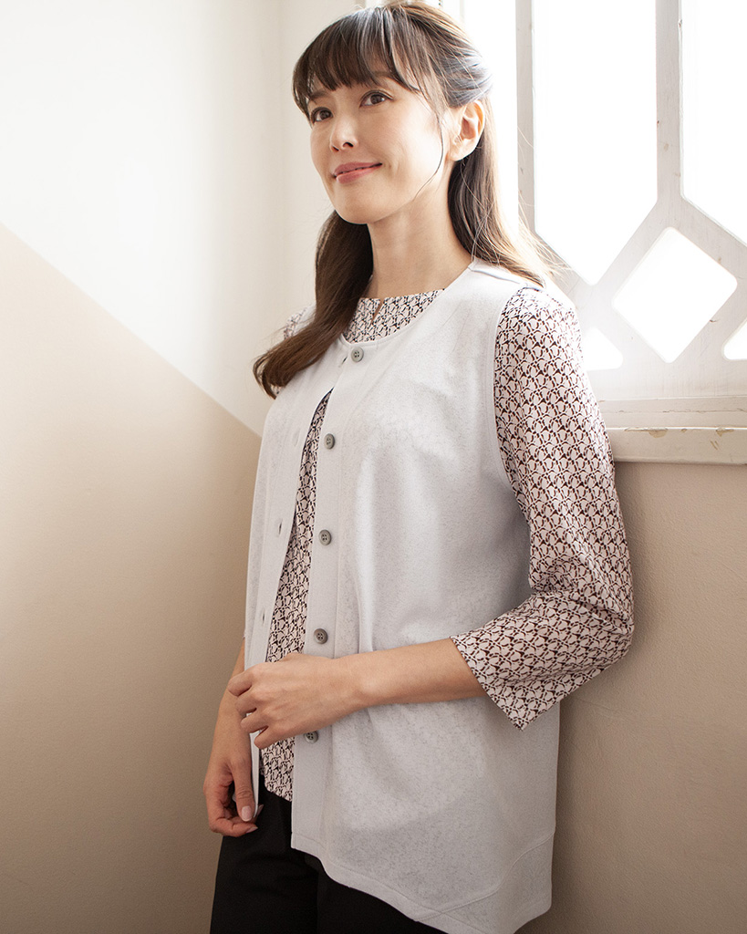 アムンゼン生地の立体的なシボとシアー感がエレガントな表情のクルーネックシアーベスト。