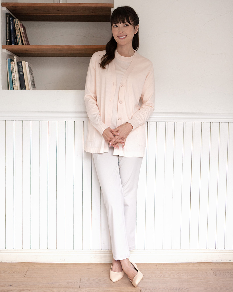 ヒップ周りをカバーしながらスタイルアップする長めの着丈にしています。