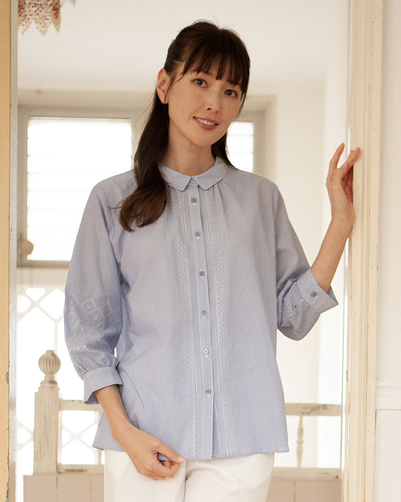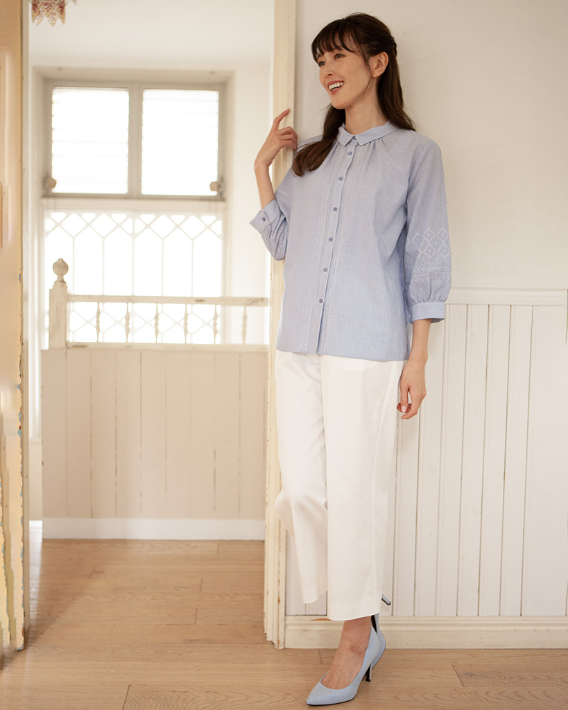 優しい肌当たりの綿セルロース素材に同系色のエンブロイダリー刺繡をアクセントにした上品な表情の刺繡ストライプブラウス。