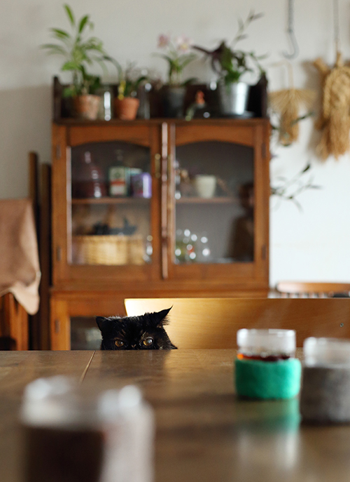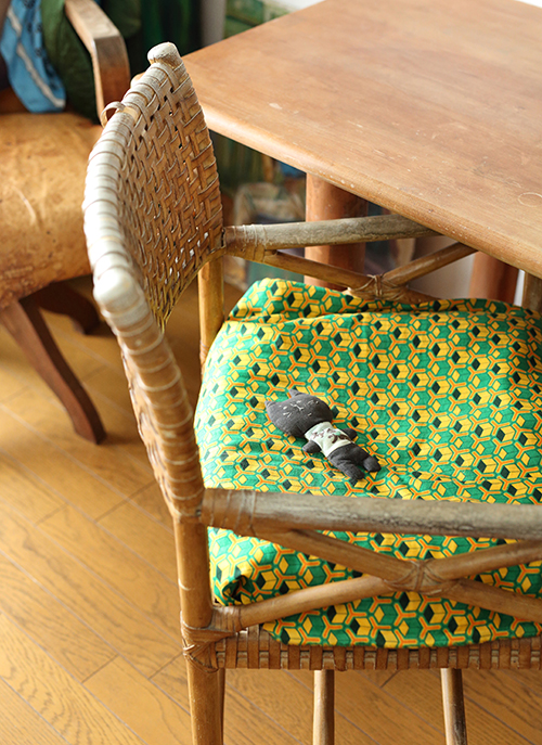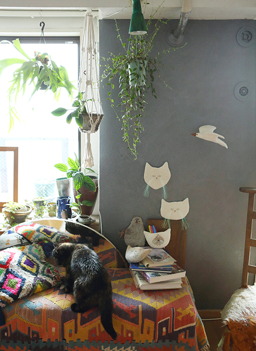羊毛を縮絨して作られた猫のオブジェは、イワタさんの作品。 リビングにキャットタワーやケージなどはなく、イワタさんの「好き」が詰まった素敵な空間ですが、イスの数が多かったり、低い家具の上にスペースがあったり、随所にハトさんが上下運動しやすいスペースが設けられています。「出窓や棚の上は格好の遊び場ですが、花瓶やオブジェを倒すことはないんですよ」。