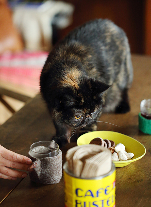 イワタさんが作った陶器のキャットボウルは、脚つきで浅めの広口に。平たい顔をしているので、普通のボウルでは食べにくいのだとか。水を飲んだあと、口のまわりがびしょびしょになるのもご愛嬌。