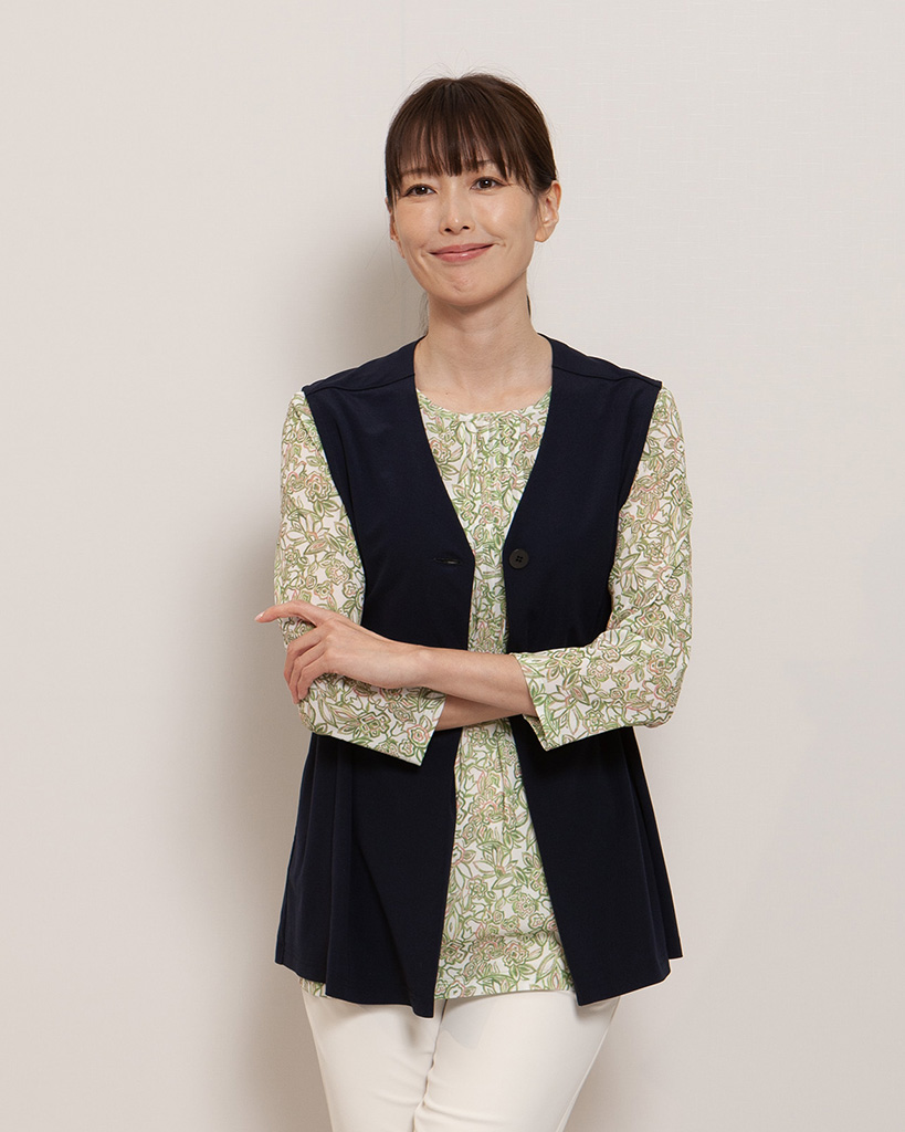 美しいドレープを描くAラインシルエットの1ボタンVネックジャージーベスト。
