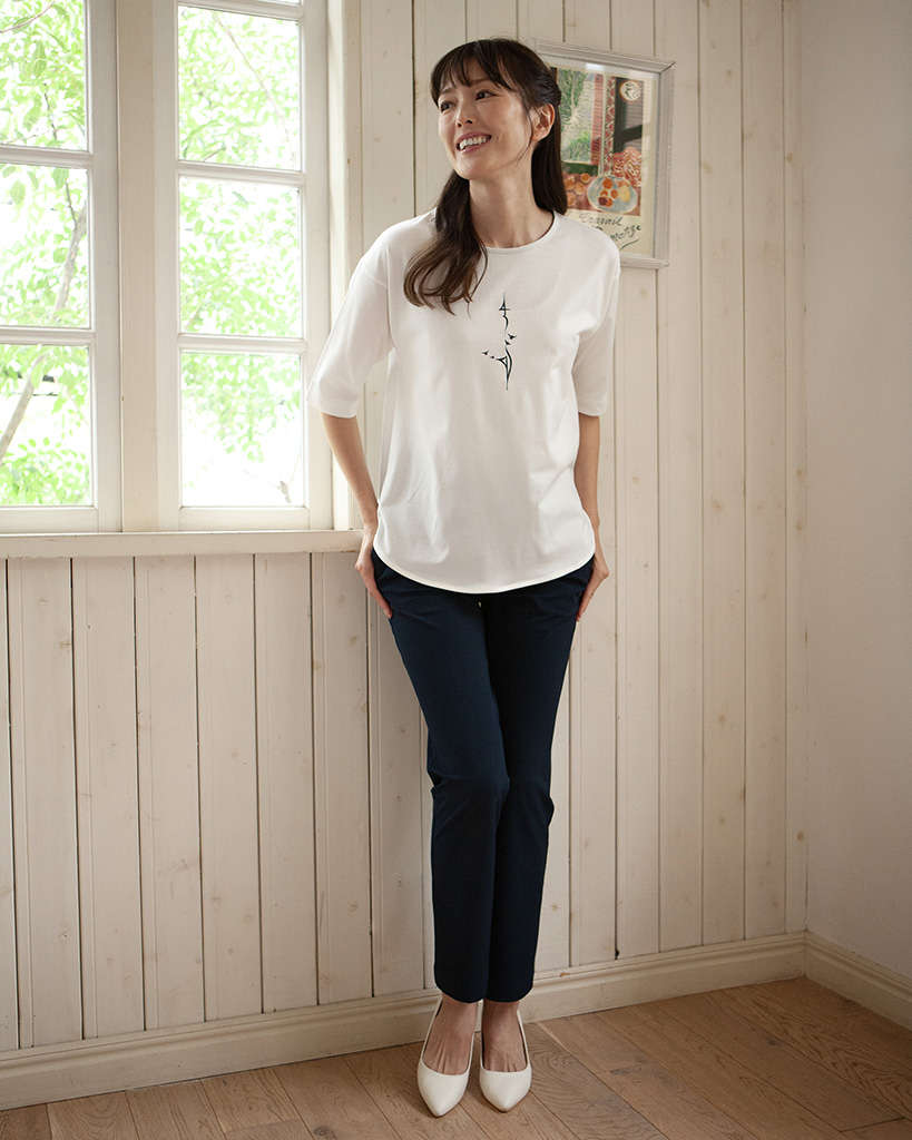 Aラインカットソー ¥13,200 胸元のカモメモチーフのプリントが爽やかな印象のコットンカットソー。 すっきりとした上品なルックスで羽織アイテムとのコーディネートにおすすめのアイテムです。 ■Shop List