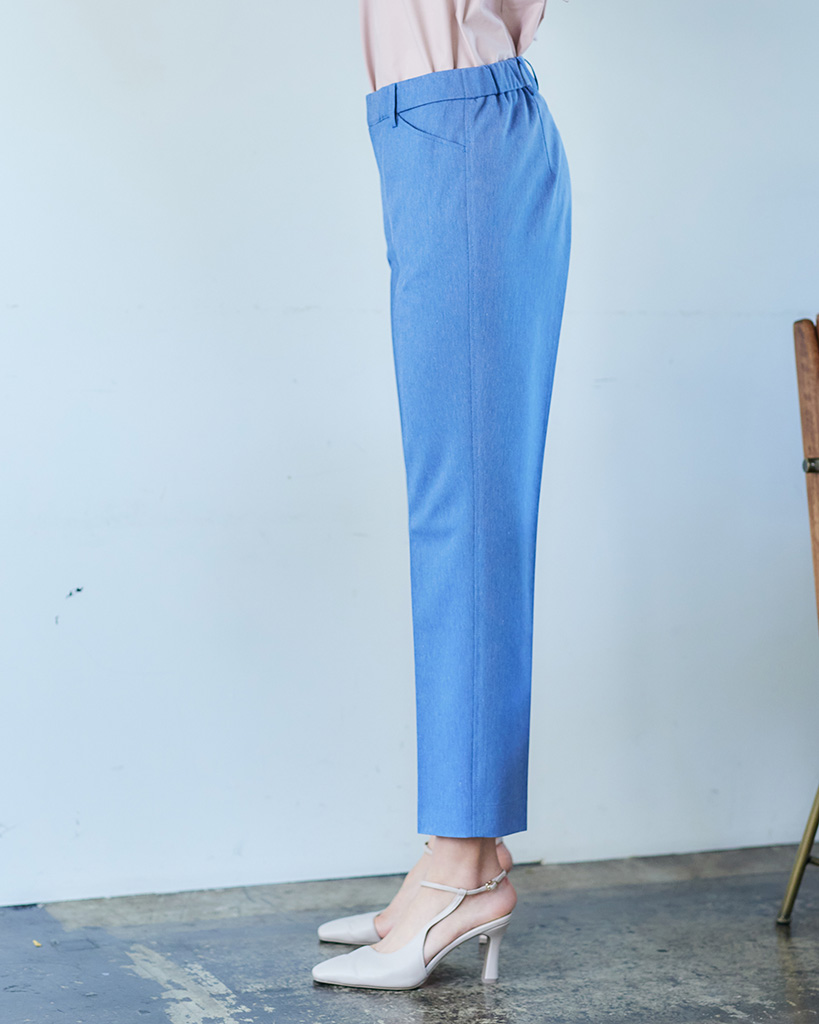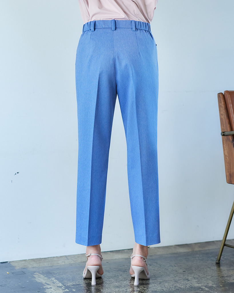 ウエスト部分はゴムを使用しているのではき心地が良く、モモまわりに程よいゆとりがあるストレートシルエットです。