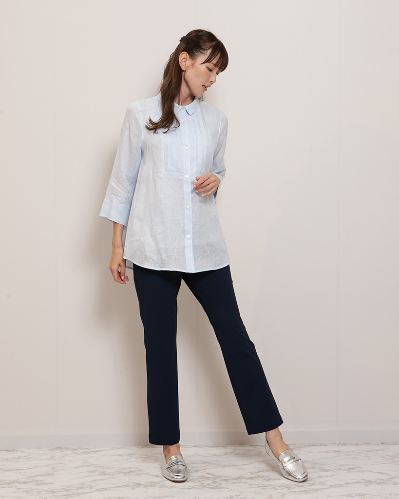 リネンの中で最上級と言われるフレンチリネンを使用したシャツカラーブラウス。