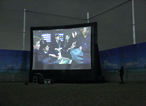 見る見るうちにスクリーンが膨らみ、何もなかった砂浜に野外シアターが出現しました。