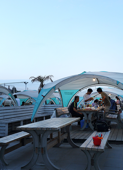 会場となったのは、東京・立川市にある日本最大のフェイクビーチ「タチヒビーチ」。海がないはずのこの場所に砂浜やバーベキュースペースが広がり、夜の映画上映会まで、みなさん思い思いにビーチリゾート気分を楽しんでいました。会場に流れる映画音楽も、これから始まる上映会の特別な時間と空間を予感させます。