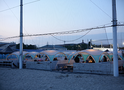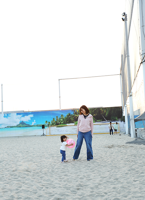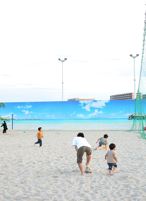 ビーチスポーツの練習場としても活用される砂浜では、ボール遊びを楽しむ家族たちの姿が。