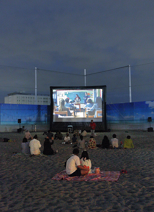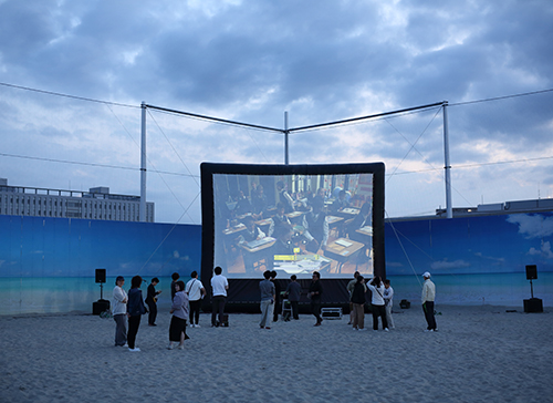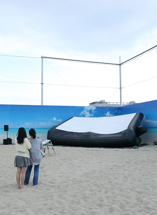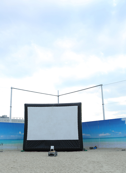 今回使用されたのは300 インチの大型エアスクリーン。設置や移動の手間がかからないエアスクリーンを活用することで、よりフレキシブルにロケーションを生かした上映会を行うことができるそうです。砂浜に設置されると、空気で膨らむスクリーンを一目見ようと人が集まってきました。