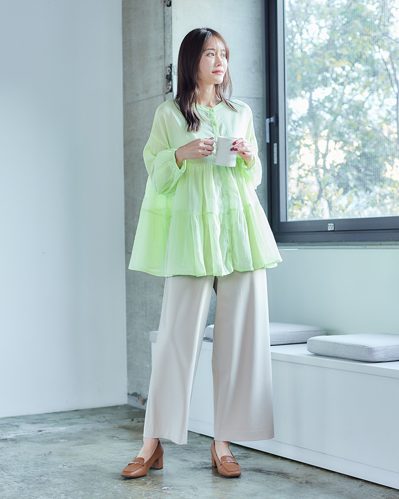 前面はフラットで後面のみギャザーを入れた仕様なので、ウエストインの着こなしも楽しめる上品でキレイなシルエットに仕上げました。