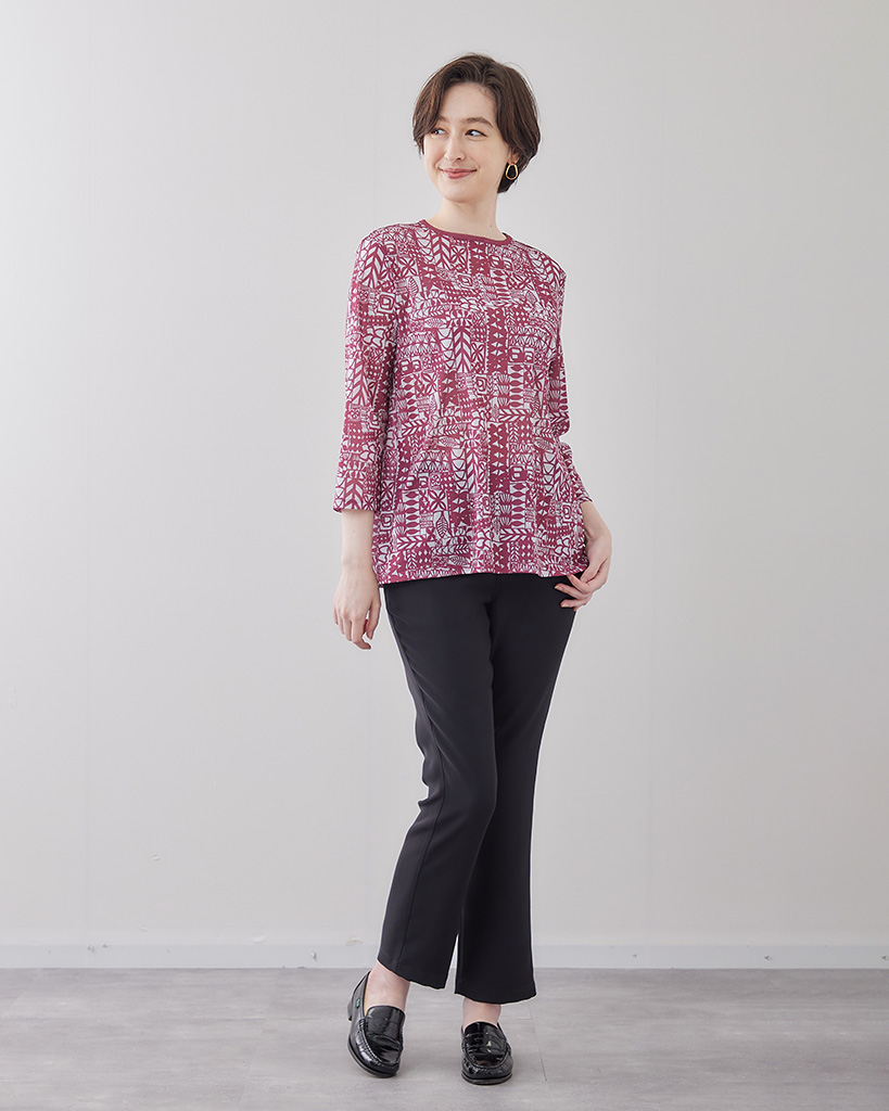 襟周りの同色系無地トリミングがアクセントになっています。