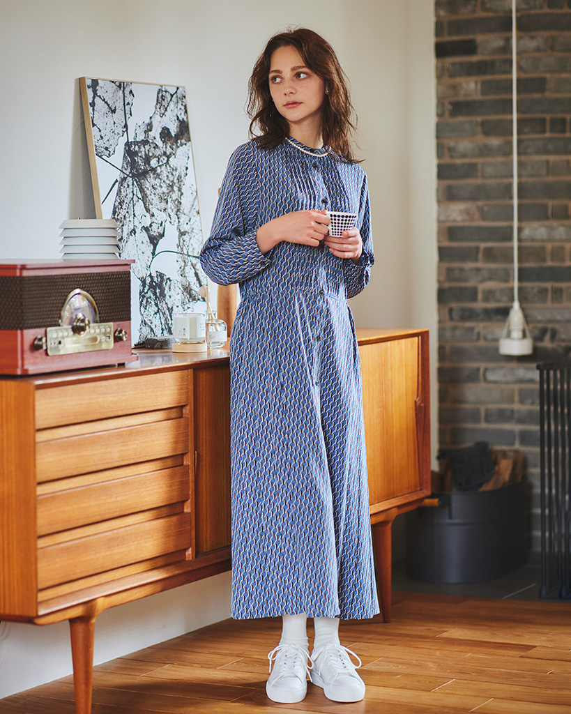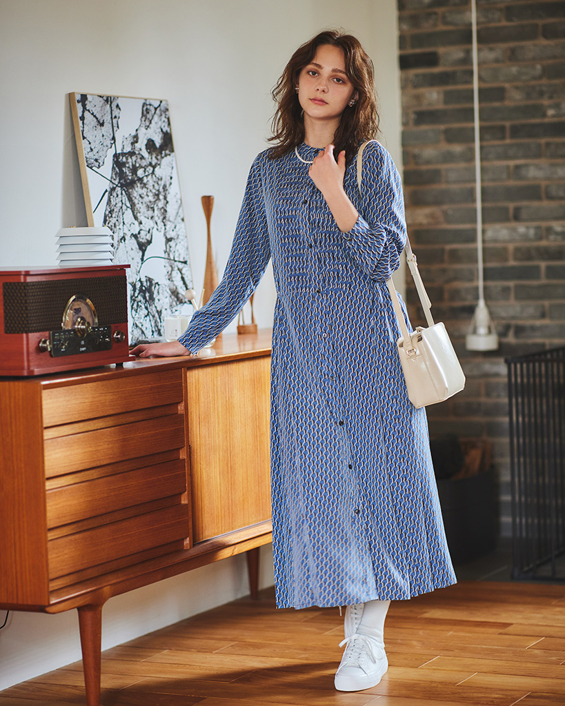 モダンな幾何柄をプリントしたバンドカラーワンピース。