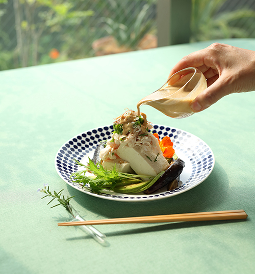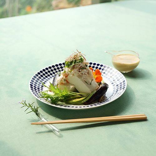 半分に切った豆腐の上に鶏ささみ肉を盛りつけ、大葉とみょうがをのせる。ナス、アボカド、水菜を添え、白ごまをふる。食べる直前にドレッシングを和える。