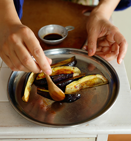 ナスを6等分のくし切りにする。フランパンにごま油を熱し、サッと炒めたら塩をひとつまみふる。皿などに取り出し、熱いうちにしょうゆをからめる。