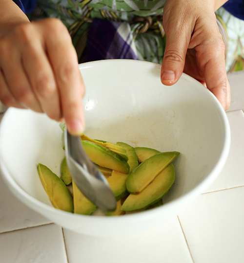 アボカドを薄くスライスし、梅酢をからめる。