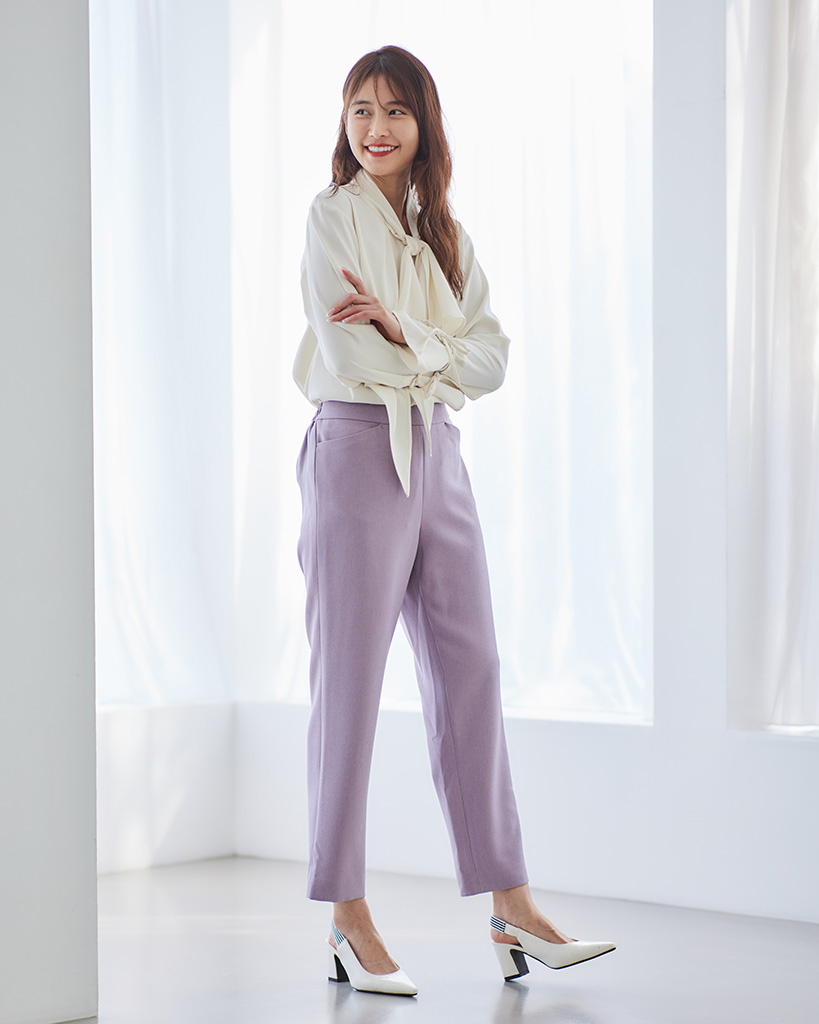 シンプルなキレイめアンクルパンツは、トップスを合わせやすく、カジュアルにもエレガントにも着こなせます。