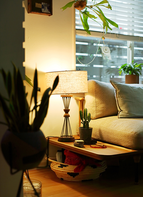 静かで落ち着いた時間を過ごしたくなる秋の夜長。備え付けの照明を消して間接照明を灯してみると、いつもの空間がくつろいだ雰囲気に変わります。「夜は間接照明とキャンドルで、質の良い眠りにつくための環境を整えるように心がけています」というように、1 日の終わりにリラックスタイムをつくることで、明日のモチベーションアップへとつながっているようです。